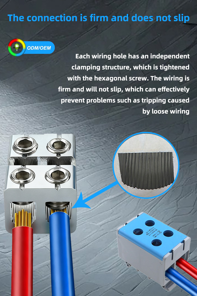 Los conductores de aluminio engrosados ofrecen ligereza, gran sección transversal y excelente resistencia a la corrosión. El nuevo nailon PA66 puede soportar altas temperaturas y presiones, manteniendo un excelente rendimiento en una variedad de entornos hostiles. Con tornillos hexagonales, afloje los tornillos antes del cableado y apriételos después de conectar los cables para completar la conexión, lo que garantiza una conexión segura y duradera.