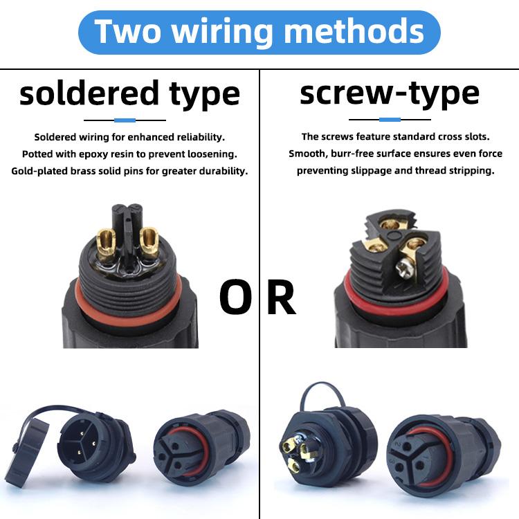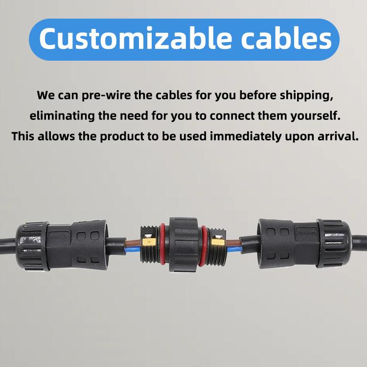 Los conectores se pueden utilizar para conexiones de cable a cable (en línea) y de cable a montaje en panel. Cada lado puede ser de contacto macho o hembra (versiones de enchufe o enchufe), las tapas de sellado IP67 están disponibles tanto para el conector del cable como para el conector del panel.